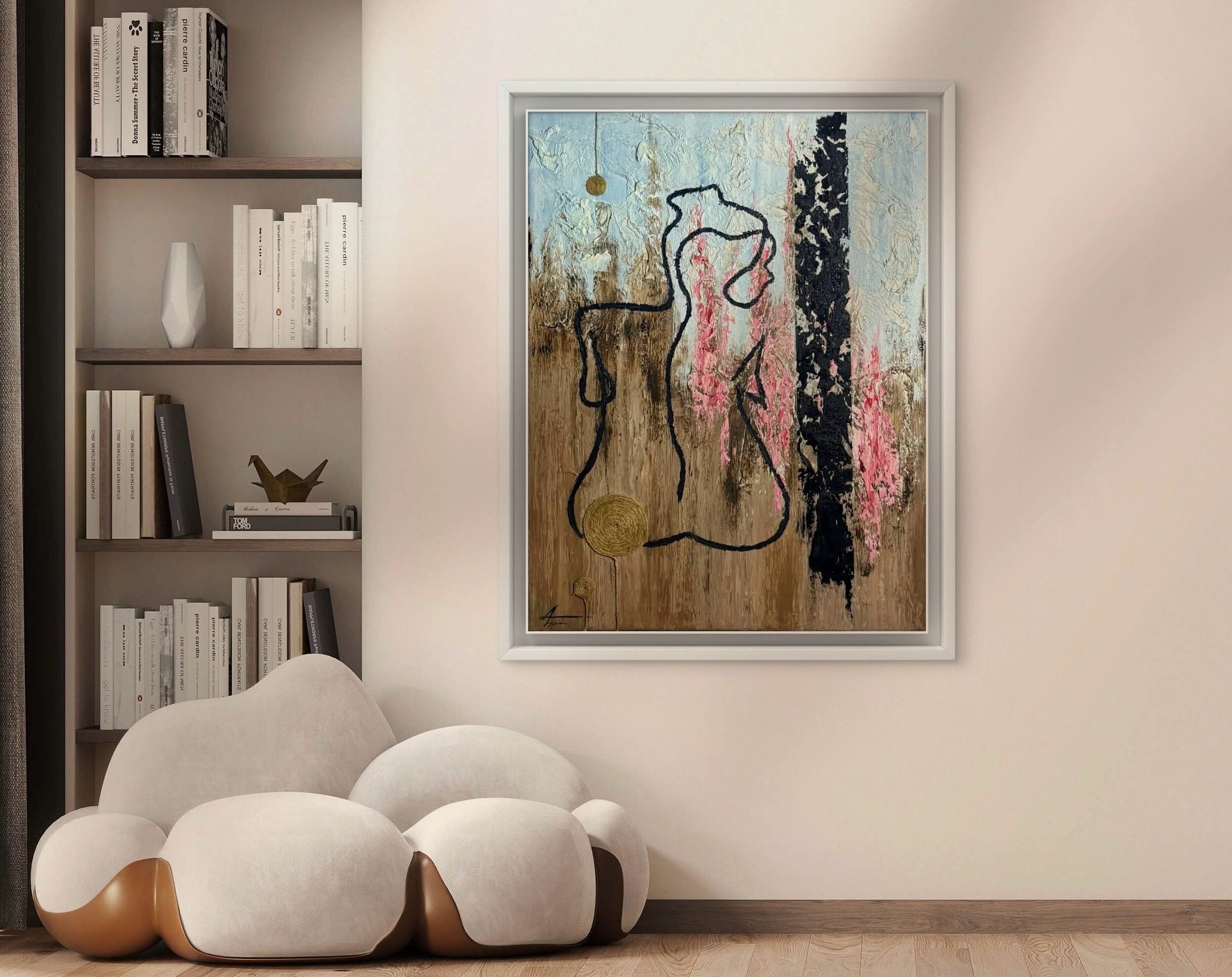 خط بسيط يرسم جسدًا بلا ملامح، كأنه إنسان موجود وغائب في الوقت نفسه. يقف بين الأرض والسماء، محاطًا بآثار الماضي. اللوحة تحكي عن إنسان يبحث عن هويته وسط ضجيج العالم، ويحاول أن يسمع صوته الداخلي