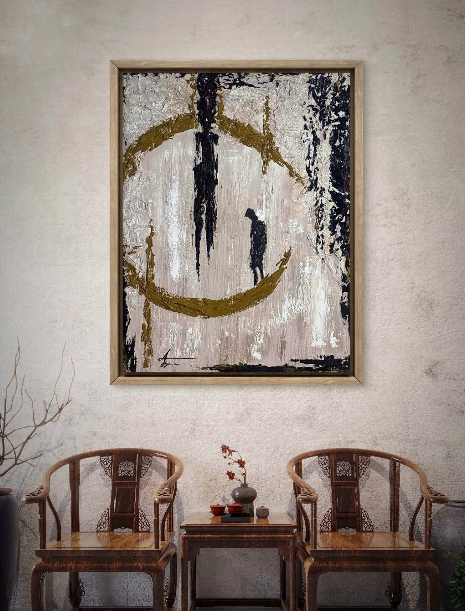 شخص وحيد يقف داخل دائرة ذهبية، كأنها حدود الحياة أو الزمن. حوله صمت، وفوقه أثر ثقيل. اللوحة تحكي عن لحظة تأمل عميقة، حين يواجه الإنسان نفسه، ويفهم أن العزلة أحيانًا بداية السلام